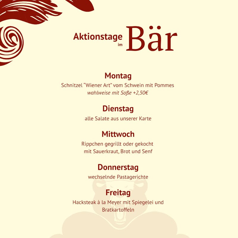 Ab dem 09.02 bis zum 13.03 servieren wir Ihnen von Montag bis Freitag wechselnde Bären-Klassiker zum bärenstarken Preis von 12,50€.