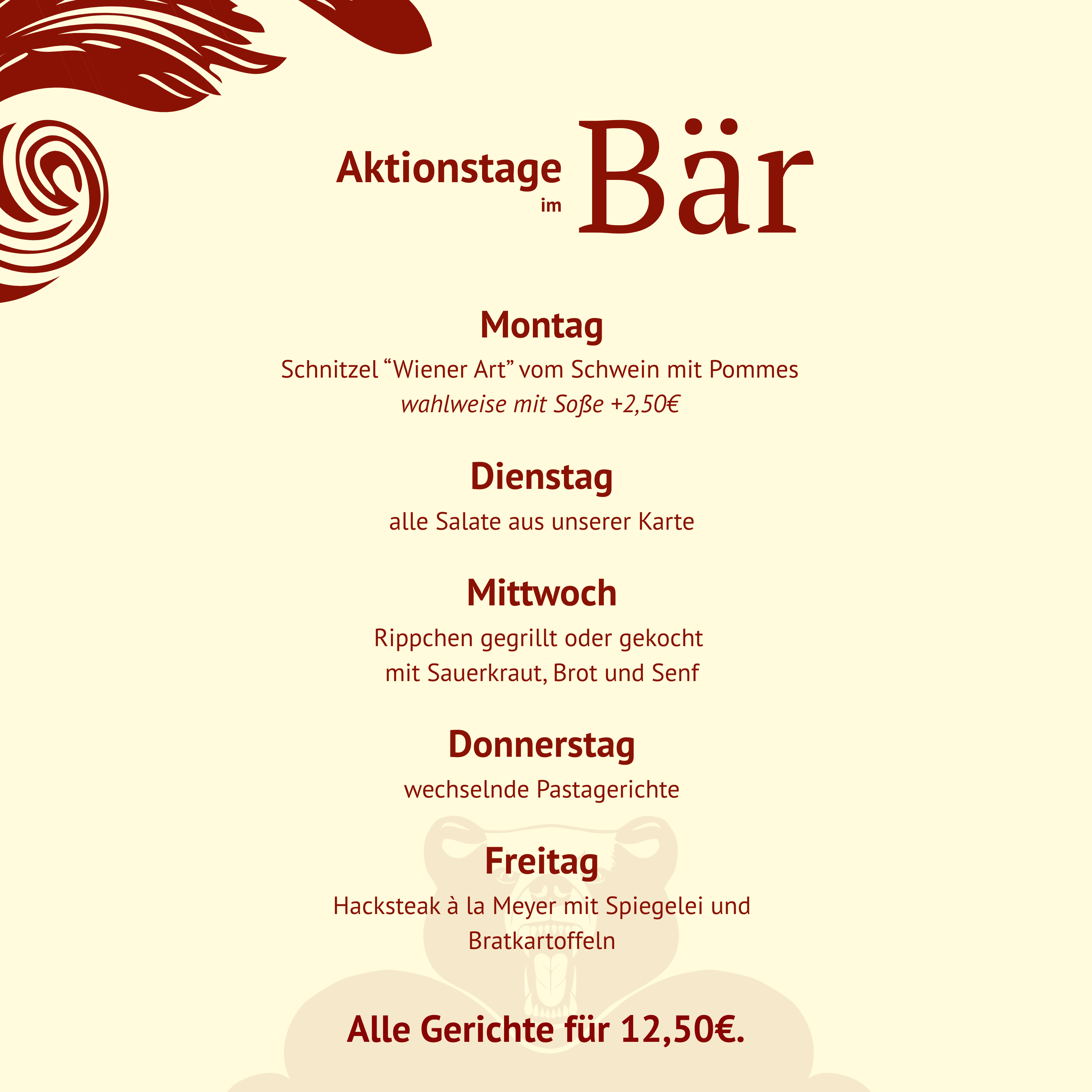 Ab dem 09.02 bis zum 13.03 servieren wir Ihnen von Montag bis Freitag wechselnde Bären-Klassiker zum bärenstarken Preis von 12,50€.